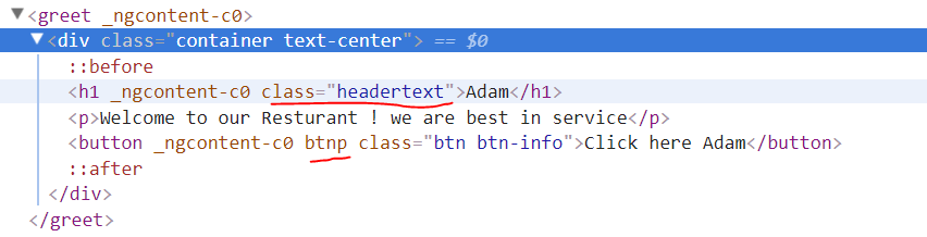 您将获得与上述相同的输出,但是这次您使用类名和属性来投影内容。当您检查DOM上的元素时,您会发现投影元素的属性名称和类名称,如下图所示: